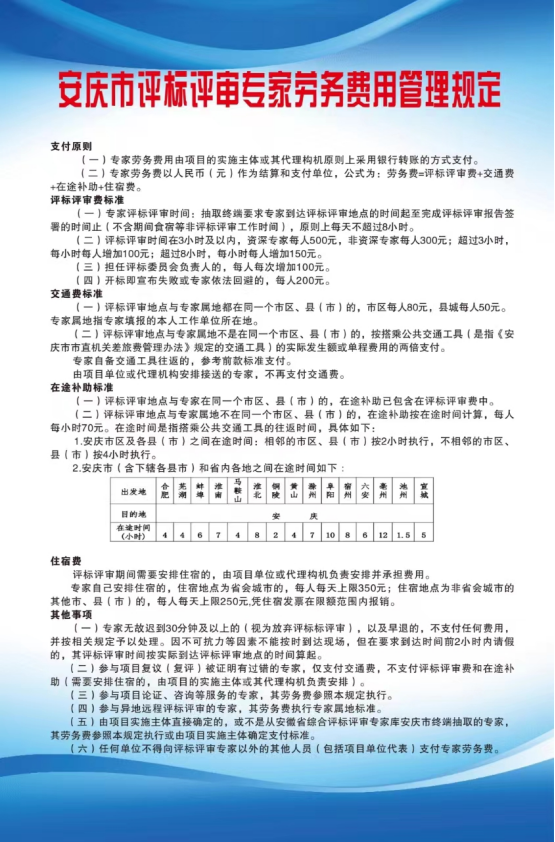 注:評審專家勞務(wù)費標準不低于《安慶市評標評審專家勞務(wù)費用管理規(guī)定》的2倍。具體金額根據(jù)需評審項目另行商定。