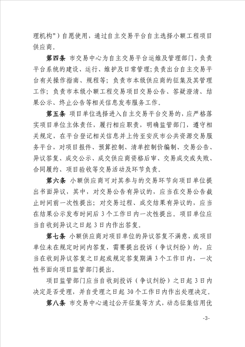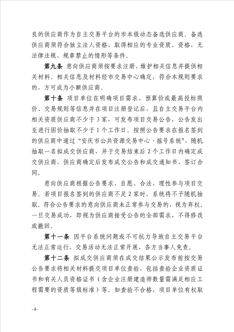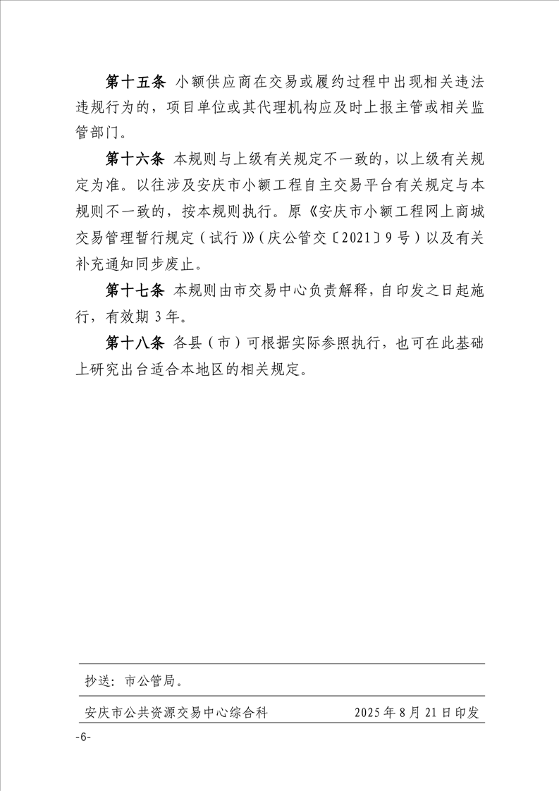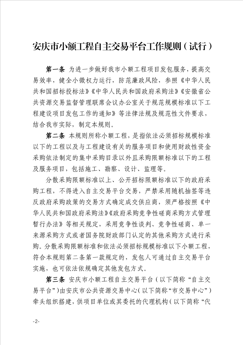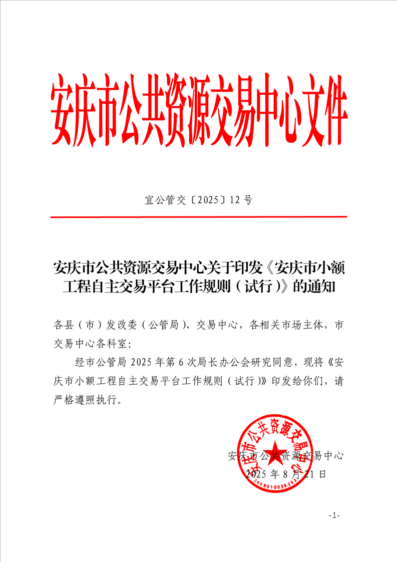 安慶市公共資源交易中心關(guān)于印發(fā)《安慶市小額工程自主交易平臺工作規(guī)則(試行)》的通知